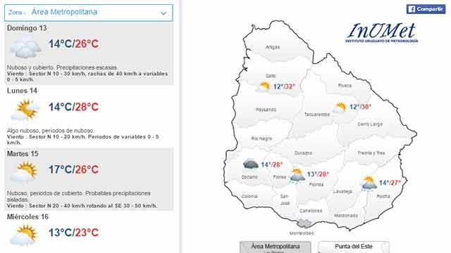 Según el Instituto de Meteorología, este domingo estará nuboso y cubierto con precipitaciones escasas. La máxima pronosticada es de 26ºC para el área metropolitana y la mínima de 14ºC.