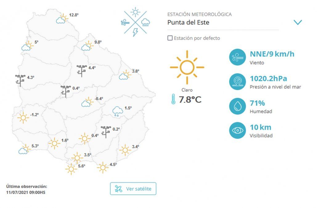 Según informa el Instituto Uruguayo de Meteorología, el tiempo en el sur está Claro con viento Calmo. La humedad 79% y la visibilidad 15 km. Hacia la tarde noche aumentará la nubosidad. La mínima 1º y la máxima esperada 18º.