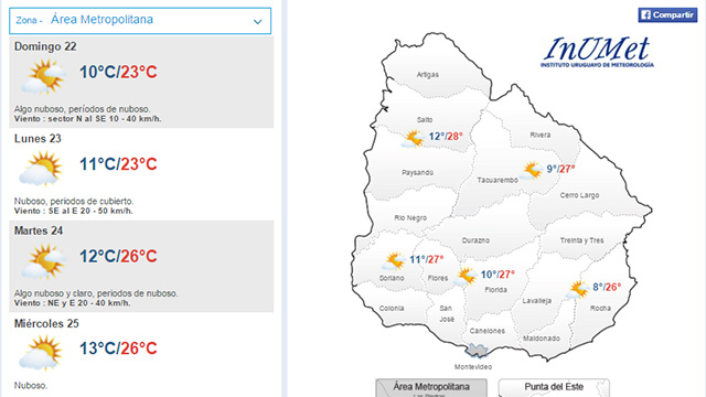 Según el Instituto de Meteorología, este domingo estará algo nuboso con períodos de nuboso. La máxima prevista es de 23ºC y la mínima de 10ºC.