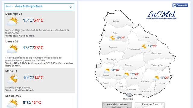 Según el pronóstico del Instituto Nacional de Meteorología, este domingo se presentará nuboso con máxima de 24ºC en el área metropolitana y mínima de 13º.