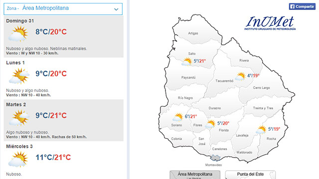 El lunes se espera una máxima de 20ºC en Montevideo y una mínima de 9ºC. También estará nuboso y algo nuboso.