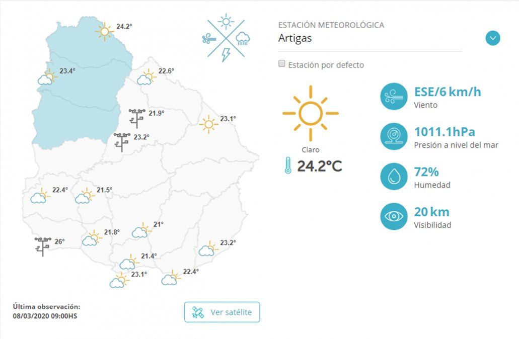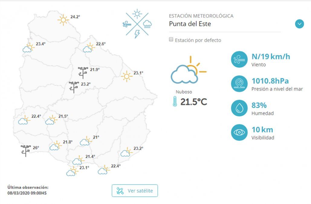 En el este el cielo está nuboso, con viento del N/19km/h. El porcentaje de humedad es de 83% y la visibilidad 10 km. La temperatura mínima fue de 19º y la máxima esperada en la zona es de 29º.