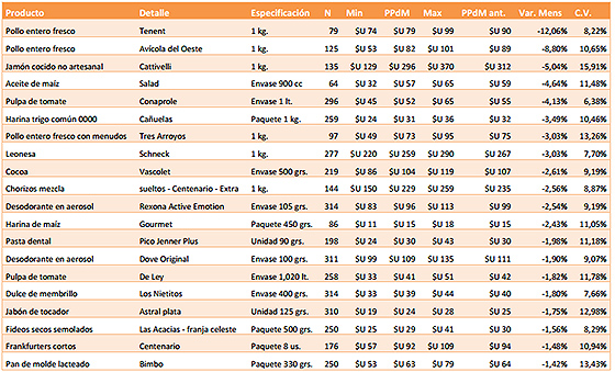 Entre los productos que más redujeron sus precios están tres marcas de pollo entero fresco, una marca de jamón cocido no artesanal, una marca de aceite de maíz, una marca de pulpa de tomate, una marca de harina de trigo común 0000 y una marca de leonesa.