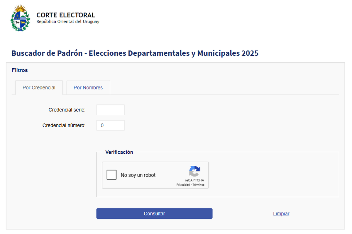 La búsqueda se puede hacer por dos vías: "Por credencial" o "Por nombres". En el primer caso, la persona debe digitar su serie y número de credencial. En el segundo caso, se busca con nombre, apellido y fecha de nacimiento del votante.