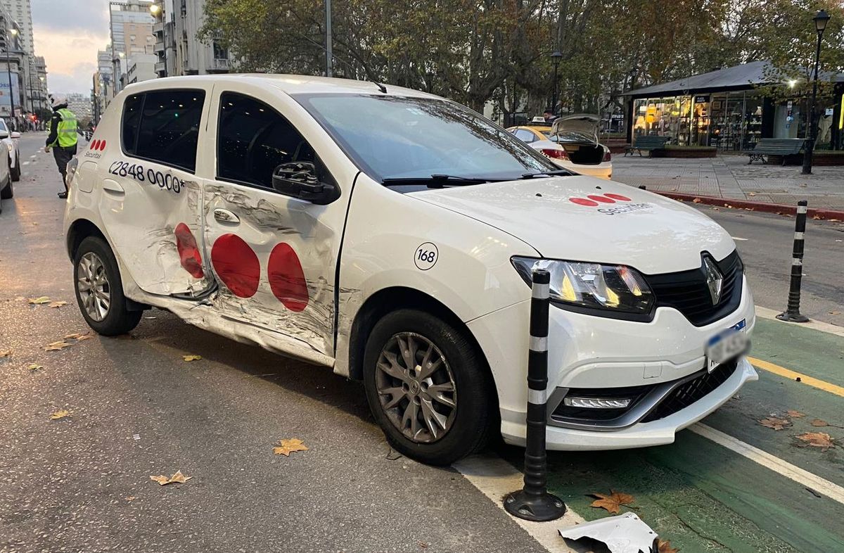 En el cruce de 18 y Magallanes quedó la moto tirada en el pavimento, el taxi estacionado a un costado y el auto de la empresa de seguridad sobre la ciclovía.