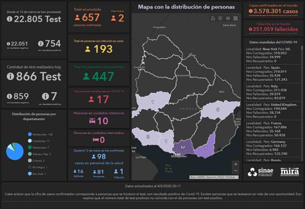 Uruguay sumó dos nuevos casos de coronavirus COVID-19 este lunes 4 de mayo, lo que da una cifra total de 657 personas infectadas desde que comenzó la emergencia sanitaria el 13 de marzo. Del total de casos, 447 ya recuperaron y 17 personas fallecieron.