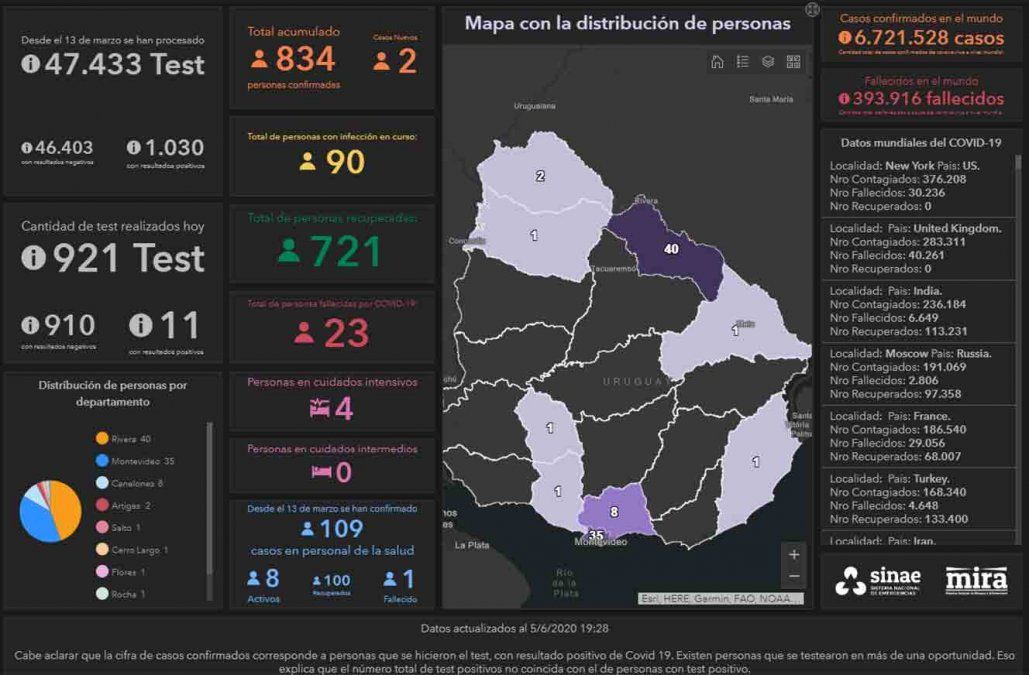 Uruguay sumó este viernes dos nuevos casos de coronavirus COVID-19, lo que da una cifra total de 834 casos positivos acumulados en el territorio. de este total, 721 personas ya se recuperaron y 23 fallecieron.