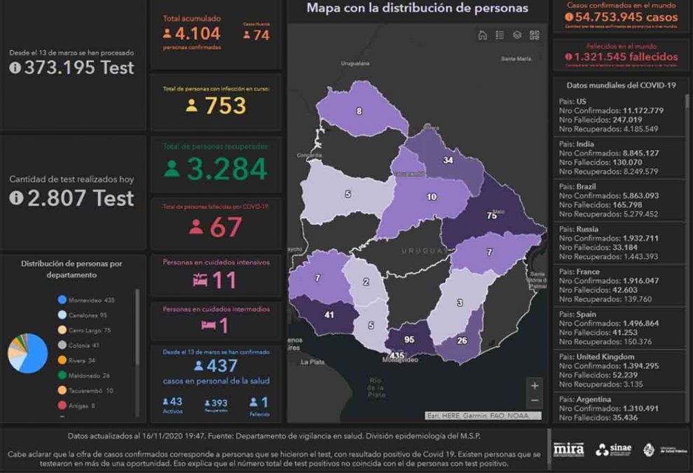 De los casos nuevos, 46 son de Montevideo, 13 de Canelones, siete de Rivera, cinco de Cerro Largo, uno de Maldonado, uno de Soriano y uno de Tacuarembó. En todos los casos se mantiene un estricto seguimiento epidemiológico.