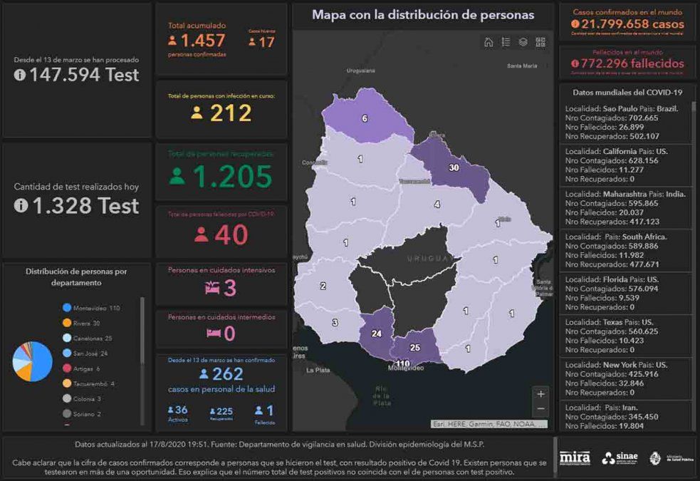 Este lunes se registraron 17 casos nuevos por coronavirus Covid-19 según la información aportada por el Ministerio de Salud Pública (MSP), lo que da una cifra total de 1.457 casos positivos acumulados desde que comenzó la emergencia sanitaria. Del total de casos nuevos, nueve se registraron en Montevideo y corresponden a un brote en una asentamiento, tres en Rivera, dos en Soriano, uno en Canelones, uno en Colonia y uno en San José.