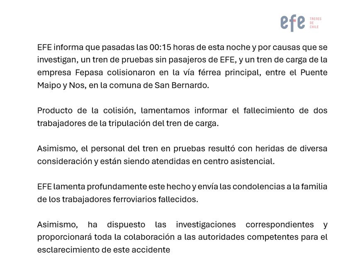 La colisión se produjo entre un tren de pruebas sin pasajeros de la Empresa de Ferrocarriles del Estado (EFE) chileno y uno de carga de la compañía empresa Fepasa.