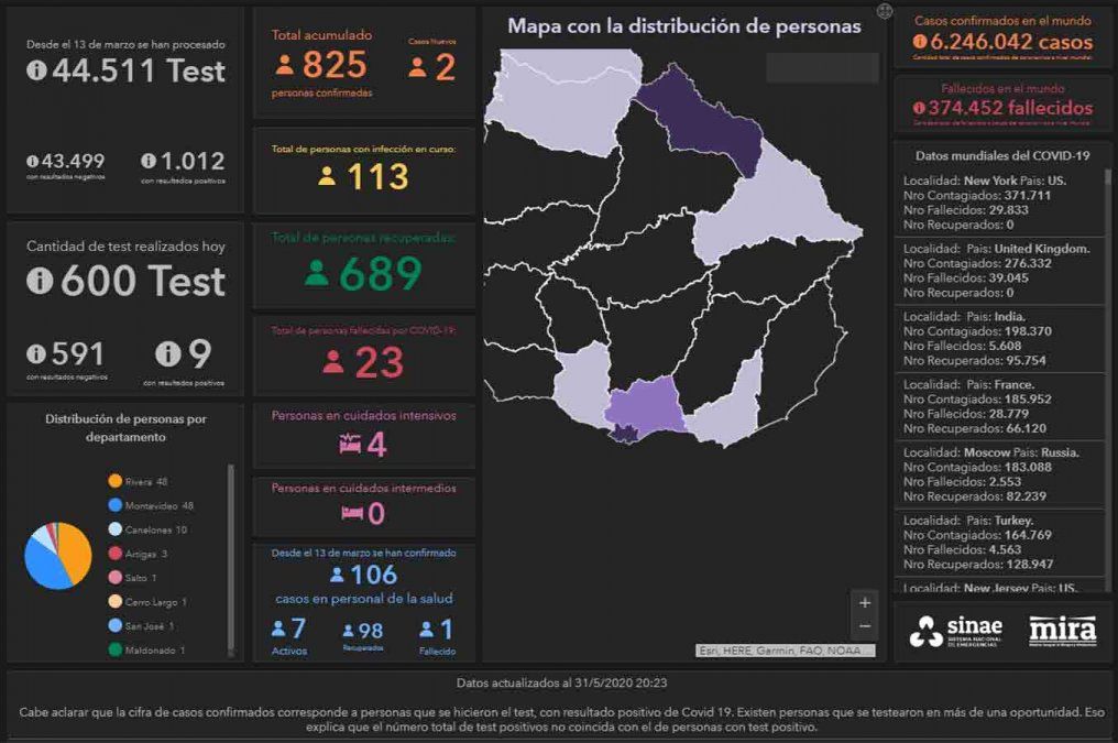 Uruguay sumó esta jornada dos nuevos casos de coronavirus en Uruguay, lo que da una cifra total de 825 casos positivos acumulados en todo el territorio desde que comenzó la emergencia sanitaria en marzo. De ese total 689 ya se recueraron y la cifra de fallecidos ascendió a 23, luego de que se conozca que un paciente de 63 años falleció este lunes en Montevideo.