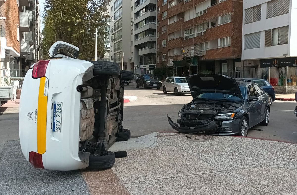 Como resultado del impacto el taxi volcó y quedo sobre la vereda de Benito Blanco, frente a la rambla.