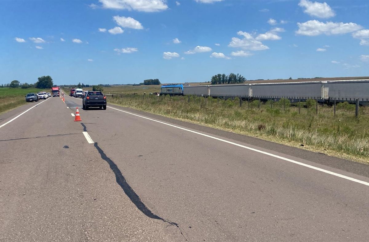 La camioneta de la Dirección Nacional de Seguridad Rural fue arrastrada por aproximadamente un kilómetro, lo que provocó la muerte de los dos policías que iban en el vehículo, informó Policía Caminera, que trabaja enlenteciendo el tránsito sobre la ruta por seguridad, se indicó. En el vehículo, se desplazaban el agente, de iniciales J.A.A., de 31 años, y el cabo R.E.T.G., de 37, que iba como acompañante.