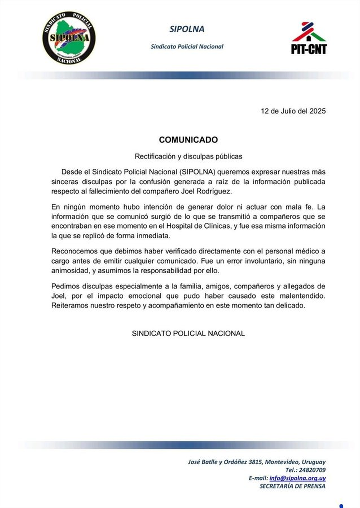 "En ningún momento hubo intención de generar dolor ni actuar con mala fe. La información que se comunicó surgió de lo que se transmitió a compañeros que se encontraban en ese momento en el Hospital de Clínicas, y fue esa misma información la que se replicó de forma inmediata. Reconocemos que debimos haber verificado directamente con el personal médico a cargo antes de emitir cualquier comunicado. Fue un error involuntario, sin ninguna animosidad, y asumimos la responsabilidad por ello", indicaron.