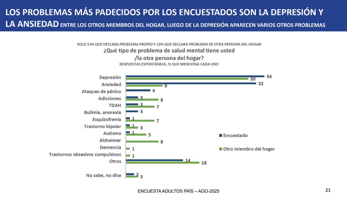 Según este estudio (realizado por Cifra en este 2025) “el 13% de los encuestados expresa que tiene algún problema vinculado a la salud mental”.