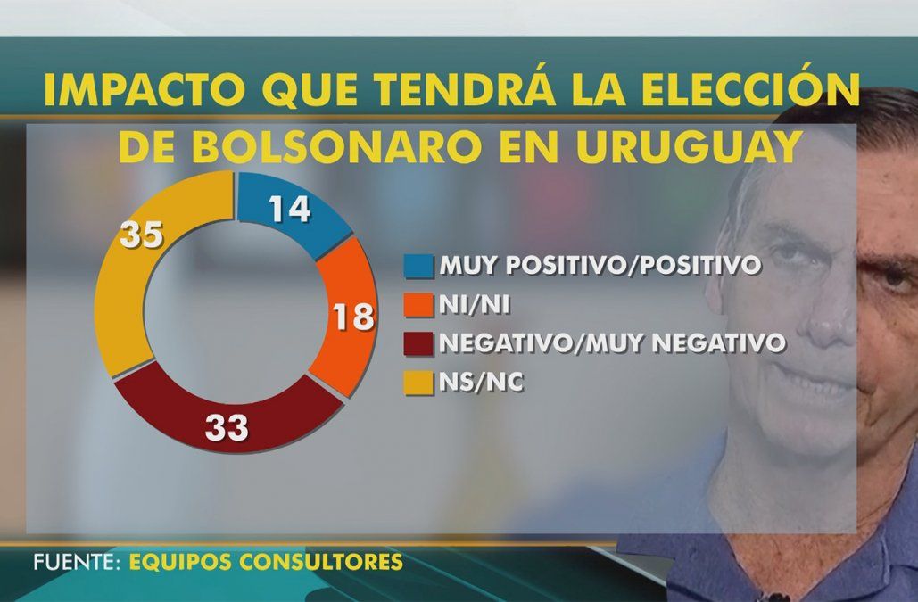 Según los datos de la consultora, el 33% cree que la elección de Bolsonaro tendrá un impacto negativo/muy negativo en Uruguay; el 18% cree que el impacto no será ni positivo ni negativo; el 14% cree que será positivo o muy positivo; y el 35% no sabe/no contesta.