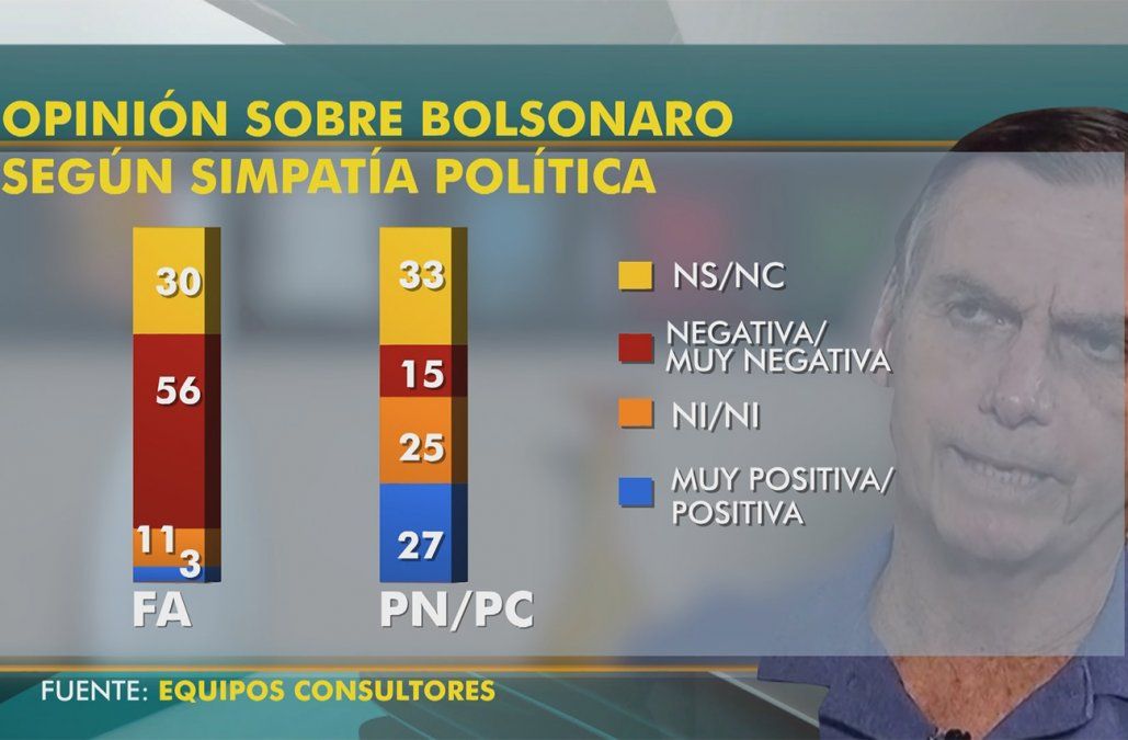 De acuerdo al sondeo, el 56% de los frenteamplistas tiene una opinión negativa o muy negativa de Bolsonaro, mientras que ese porcentaje alcanza al 15% entre los votantes del Partido Nacional y Partido Colorado. Solo el 3% de los frenteamplistas tiene una opinión positiva, mientras que entre votantes del PN y PC, alcanza al 27%.