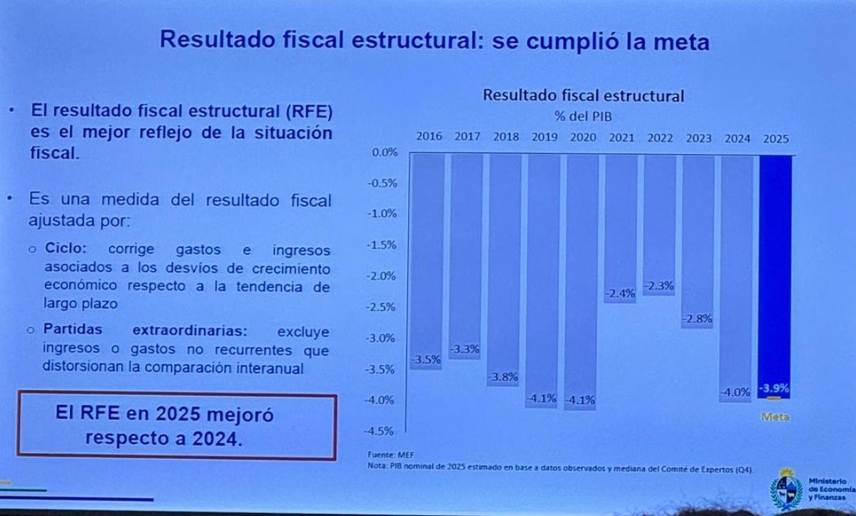 En este sentido, dice Economía, “se mantienen las metas de resultado estructural establecidas” en la ley de Presupuesto del gobierno de Yamandú Orsi (2025-2030).