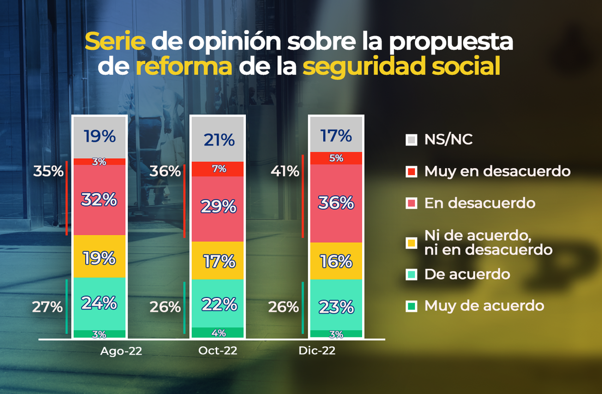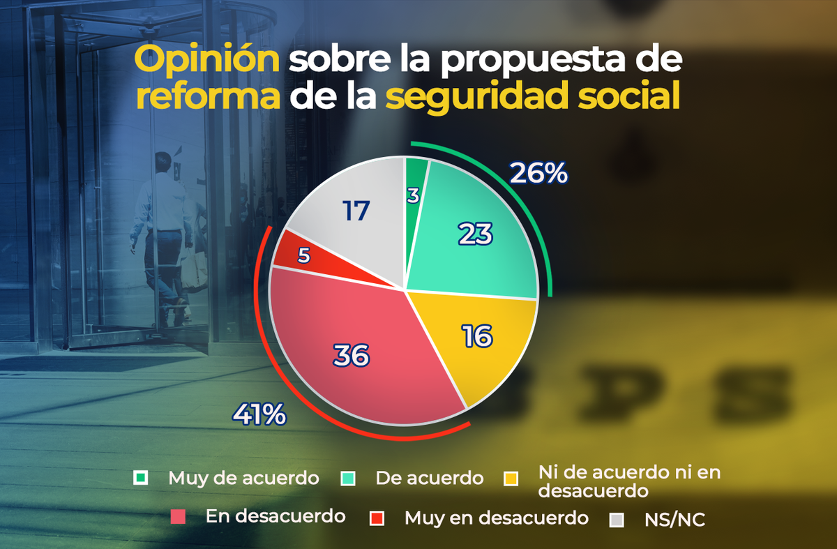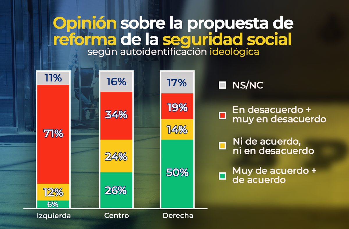 Los encuestados muestran también una estructura de juicios dividida y de saldo negativa sobre la opinión de la reforma de la seguridad social, un 26% dice estar muy de acuerdo o de acuerdo con la reforma, un 16% no está ni de acuerdo ni en desacuerdo, un 41% está en desacuerdo o muy en desacuerdo y el restante 17% no se pronuncia sobre el tema. El balance negativo es en este caso algo mayor al que se encuentra con relación a la reforma educativa.