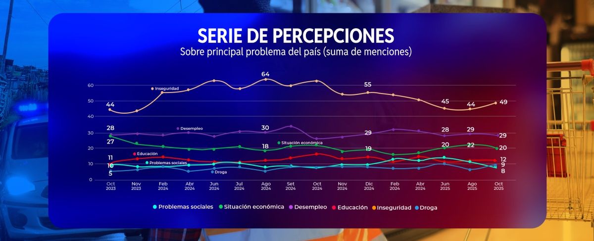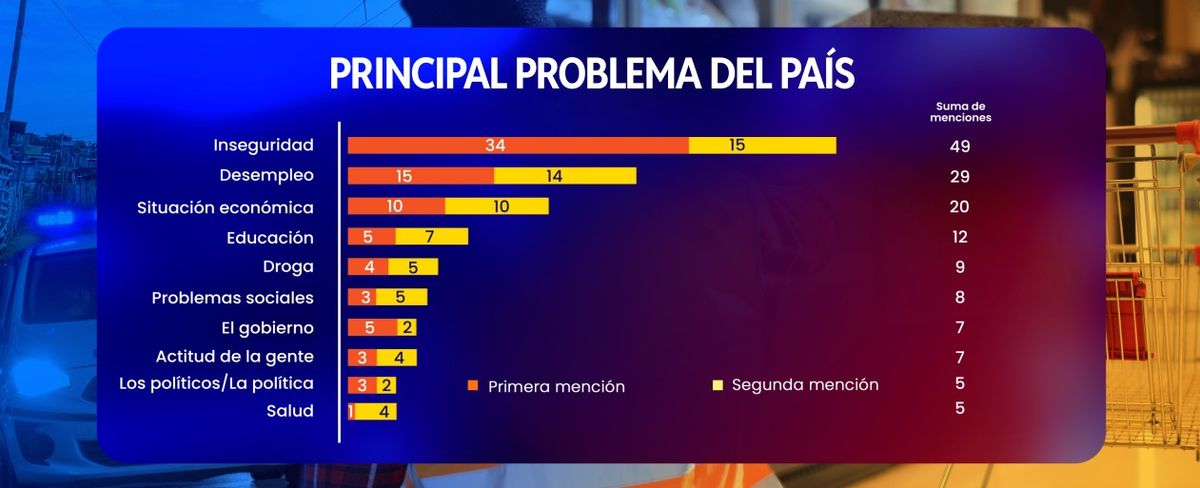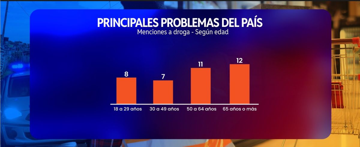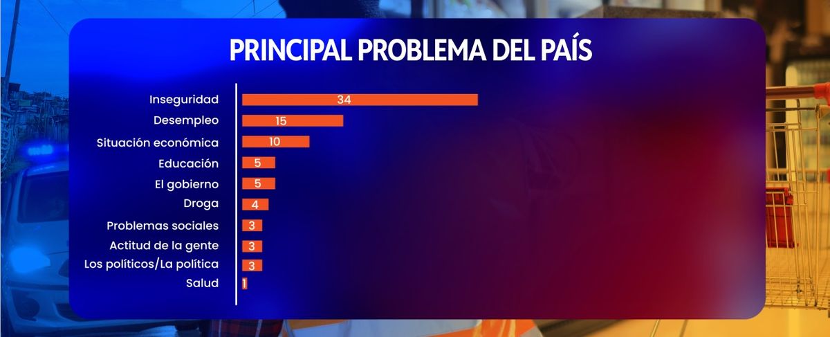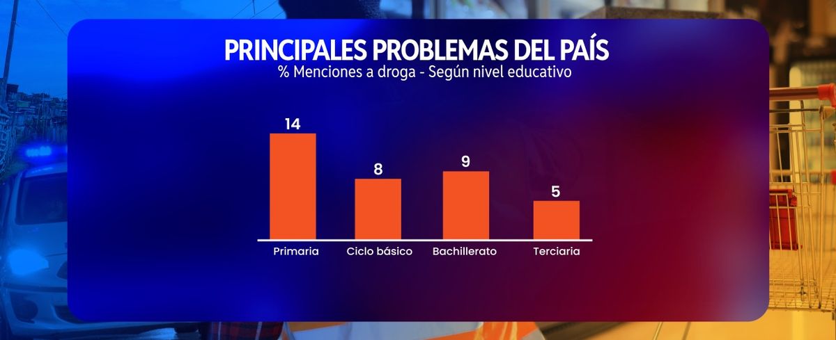 El desempleo y la economía ocupan el segundo y tercer lugar respectivamente, seguidos por la educación. Crecen las menciones al consumo de droga como un problema significativo, con mayor énfasis en el interior del país y entre los niveles educativos más bajos.