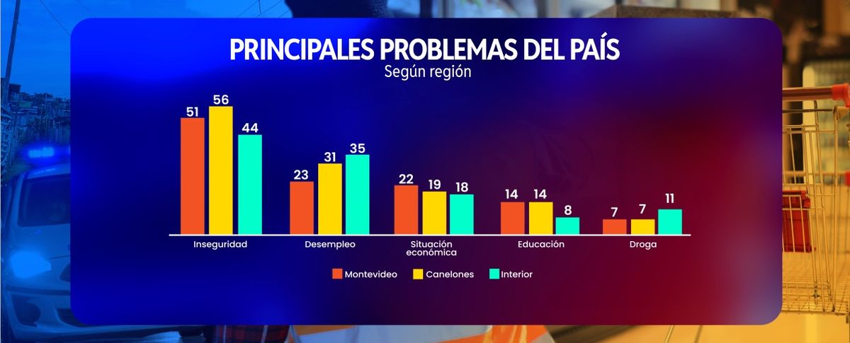 Variaciones regionales. Como es habitual, la inseguridad preocupa algo más en la zona metropolitana, y algo menos en el resto del Interior del país. Por el contrario, el desempleo se comporta de forma inversa, siendo mencionado por el 35% de los habitantes del interior. En el interior del país, además, es donde más se aprecia la preocupación por el consumo de droga.