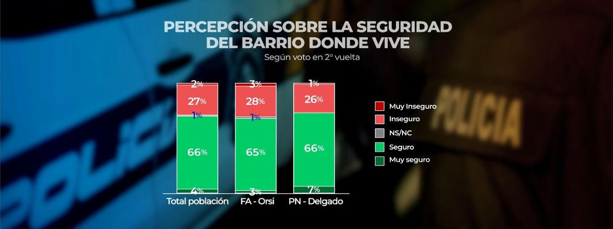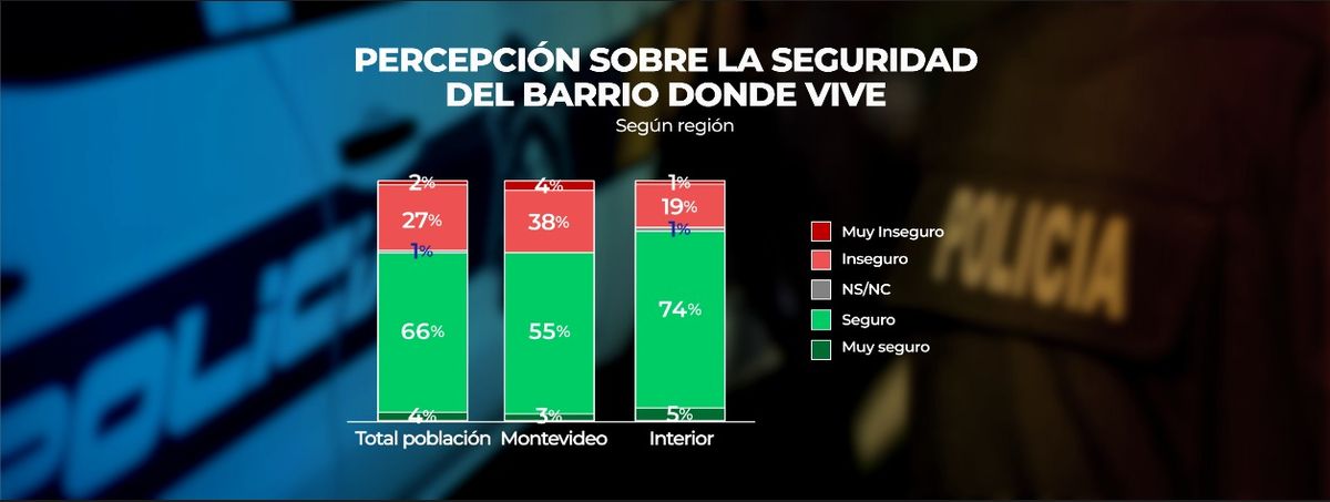 Contrastando con las percepciones sobre el país en su conjunto, siete de cada diez uruguayos perciben a su barrio como un lugar seguro. Este tipo de diferencias entre percepciones globales y locales es habitual en distintas temáticas (desde la limpieza de una ciudad respecto a su cuadra, hasta las percepciones sobre la economía individual y colectiva). Pueden estar asociadas a lo que se denomina “efecto de percepción local”, es decir, la tendencia de las personas a evaluar más positivamente el entorno cercano, y más críticamente el contexto más amplio.