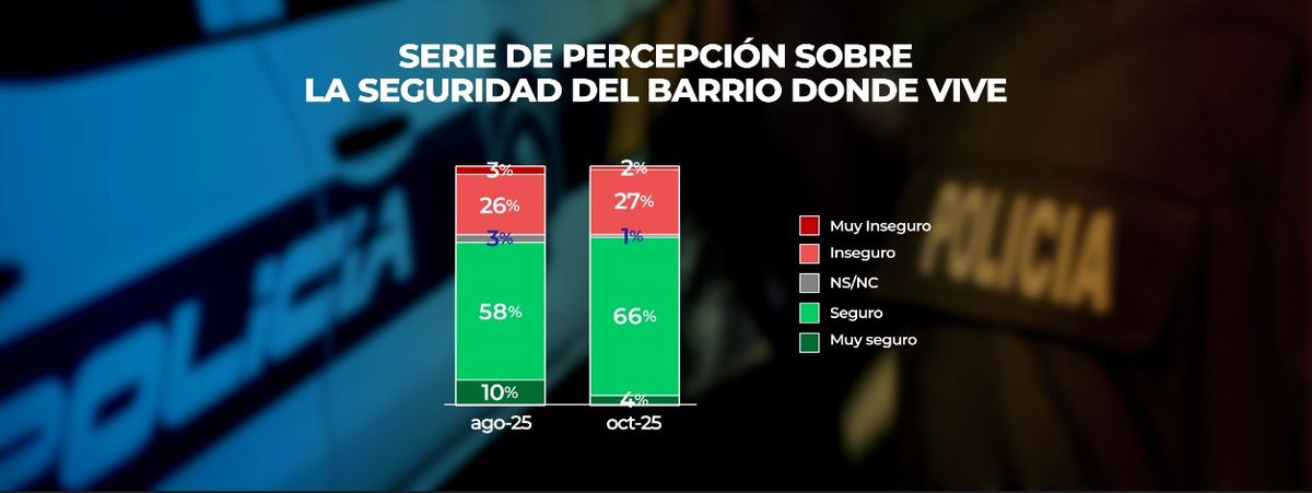 Las percepciones locales se mantuvieron estables en octubre. A diferencia de las percepciones sobre el país, que empeoraron en el último bimestre, las creencias sobre el barrio se mantuvieron en parámetros similares. La percepción de seguridad extrema (“muy seguro”) disminuye un poco, pero la suma de percepciones positivas (“seguro + muy seguro”) se mantiene estable, con leve crecimiento (dentro del error muestral).