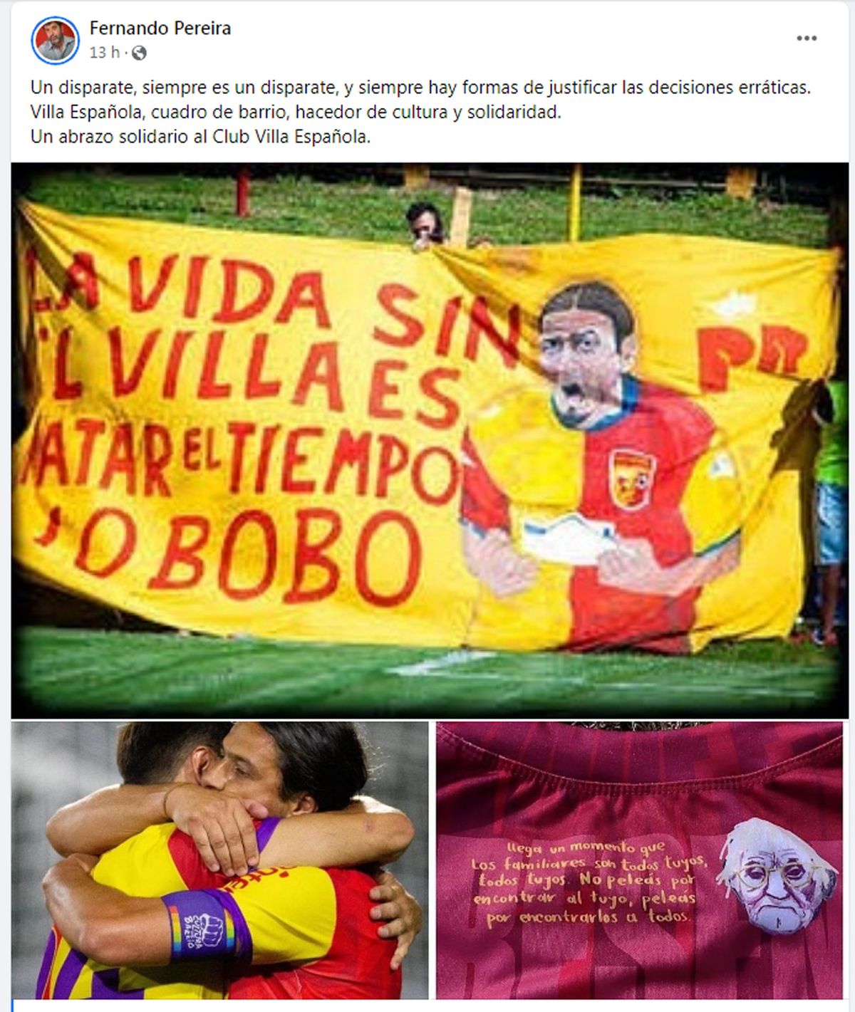 “Siempre es un disparate, y siempre hay formas de justificar las decisiones erráticas. Villa Española, cuadro de barrio, hacedor de cultura y solidaridad. Un abrazo solidario al Club Villa Española”, escribió Pereira en Facebook en la noche del jueves, tras conocer la noticia.