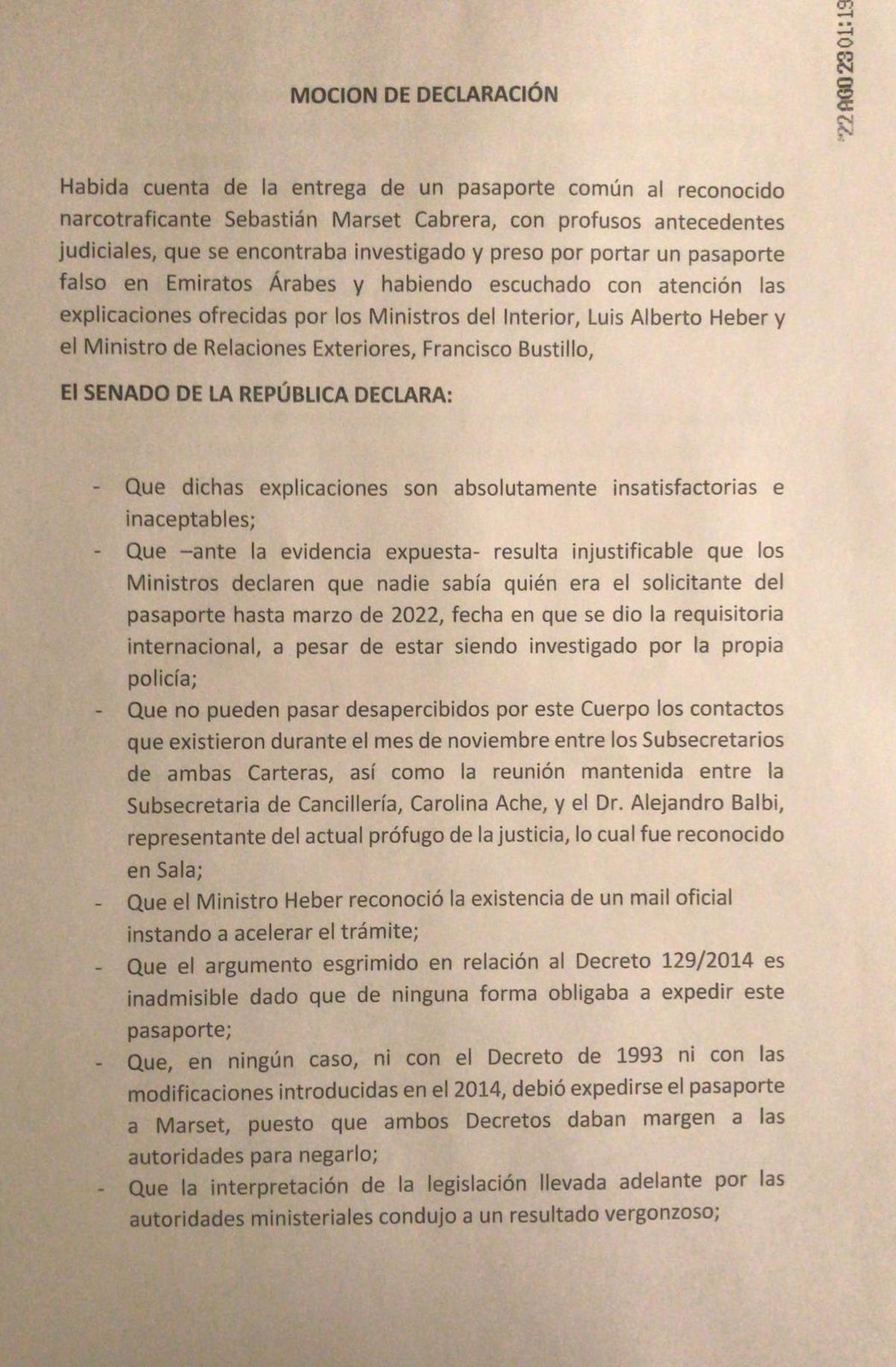 Los senadores del Frente Amplio (FA) pidieron la renuncia de los ministros Luis Alberto Heber(Interior) y Francisco Bustillo(Relaciones Exteriores) por considerar “absolutamente insatisfactorias e inaceptables” las explicaciones que dieron durante la interpelación convocada por la entrega de un pasaporte al narco uruguayo Sebastián Marset cuando en noviembre de 2021 estaba preso en Dubai tras viajar con documentación falsa.