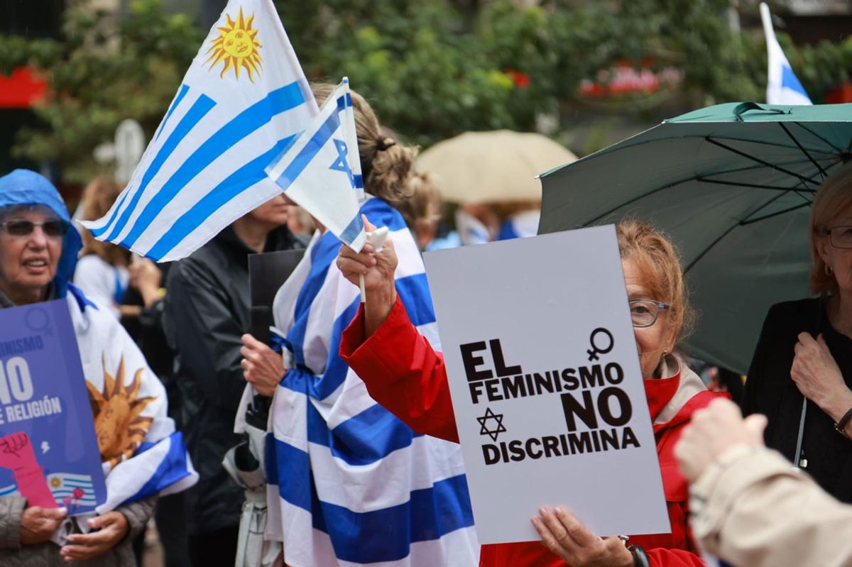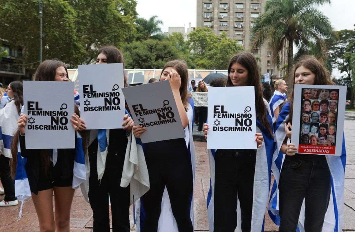 Algunas, además de los carteles, portaban banderas de Israel, como se observa en una de las imágenes captadas por la agencia FocoUy para Subrayado.