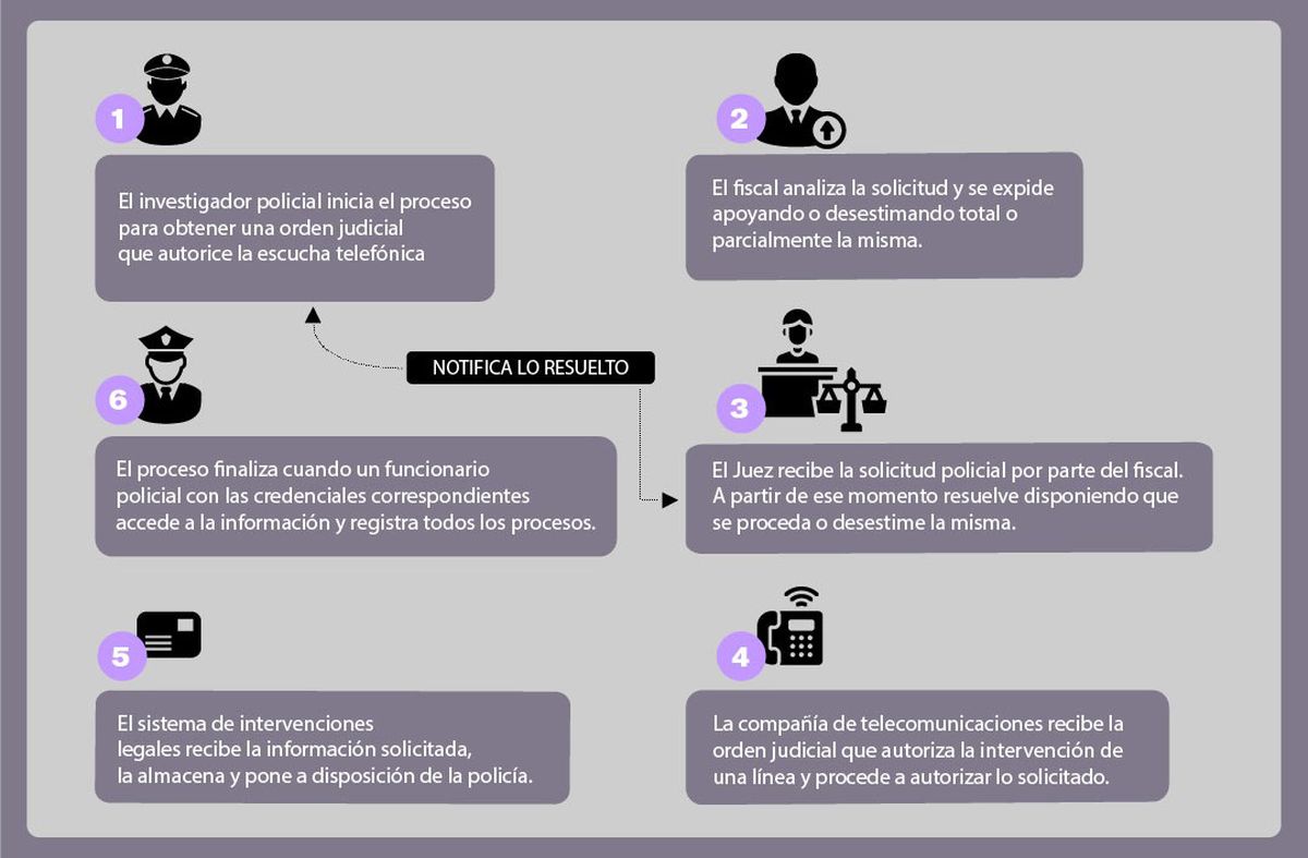 La Policía pide orden a Fiscalía. El investigador policial ingresa la solicitud, que debe justificar, a través del Sistema de Administración de Interceptaciones Legales (SAIL)