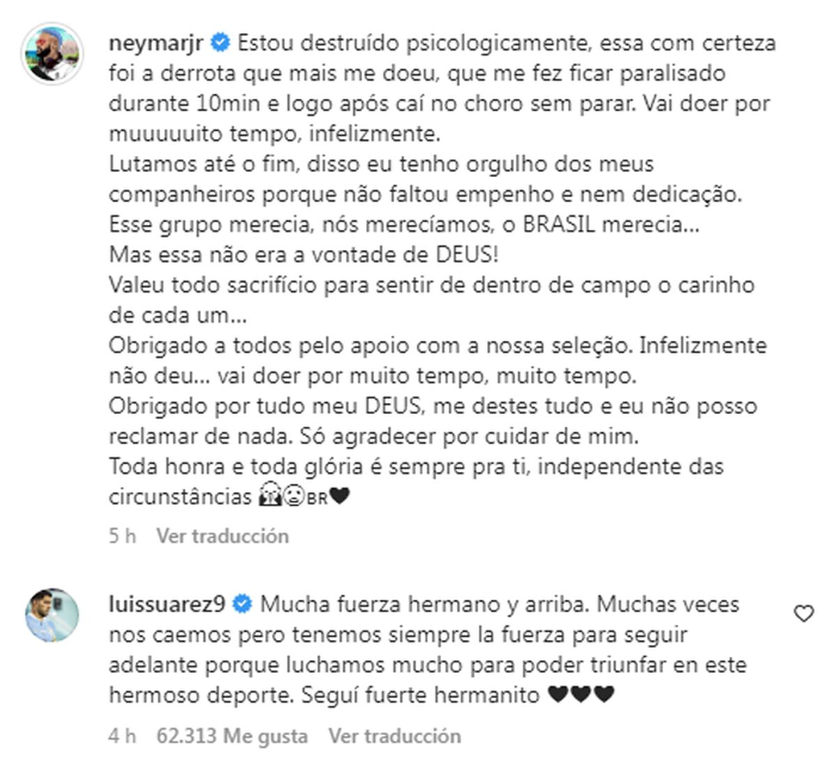 Valió la pena cada sacrificio para sentir el cariño de cada uno desde dentro del campo… Gracias a todos por el apoyo con nuestra selección. Desafortunadamente no funcionó... Va a doler por mucho, mucho tiempo. Gracias por todo mi DIOS, todo me lo has dado para no poder quejarme. Solo gracias por cuidar de mí. Toda la honra y gloria siempre son para ti, sin importar las circunstancias”.