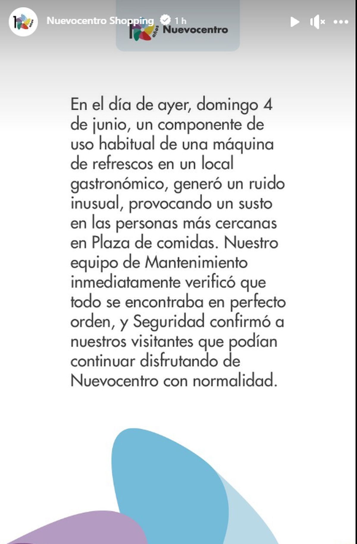 "Un componente de uso habitual de una máquina de refrescos en un local gastronómico generó un ruido inusual, provocando un susto en las personas más cercanas en Plaza de Comidas. Nuestro equipo de mantenimiento inmediatamente verificó que todo se encontraba en perfecto orden y Seguridad confirmó a nuestros visitantes que podían continuar disfrutando", indica el comunicado de Nuevocentro Shopping.