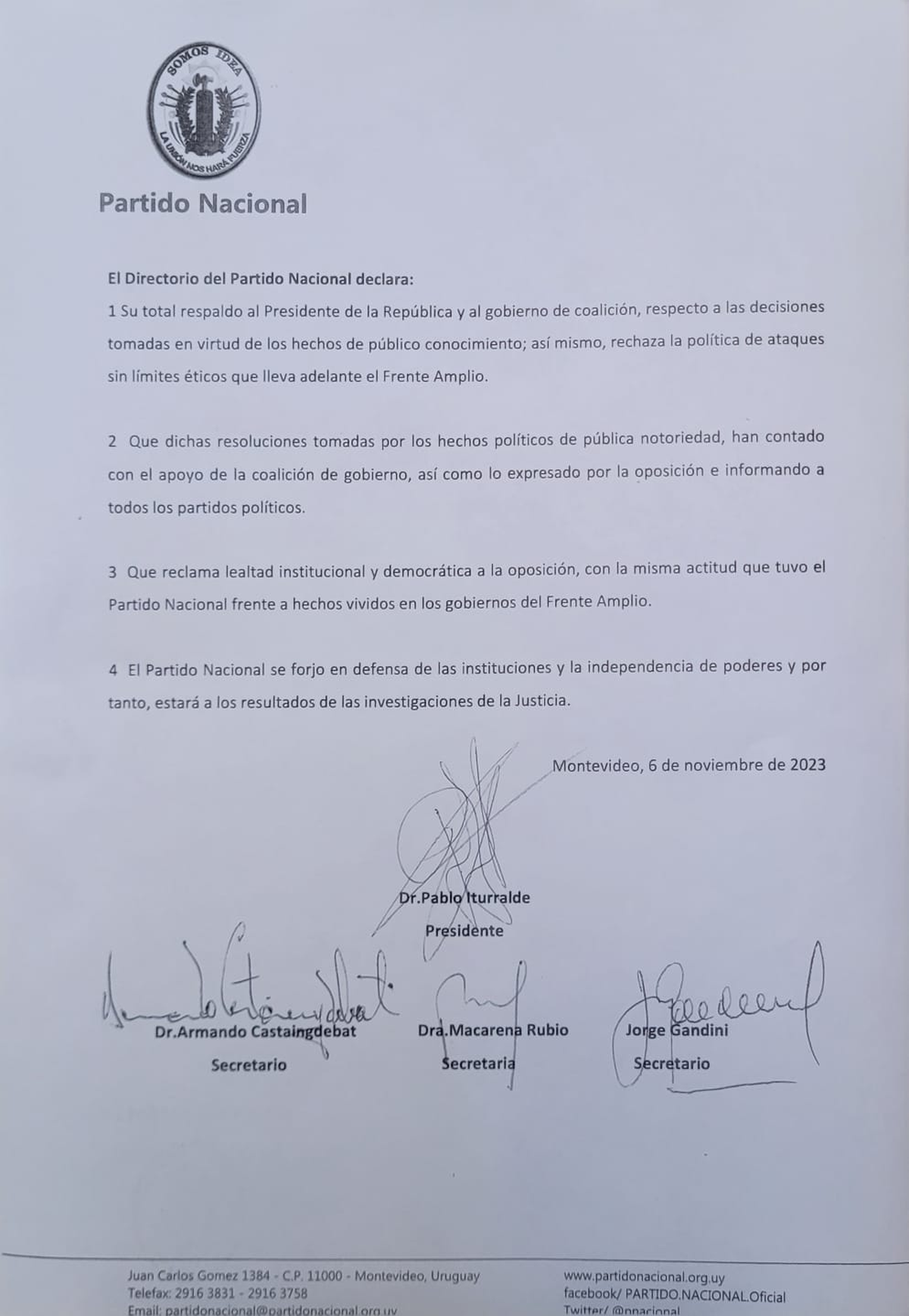 El Partido Nacional emitió una declaración de “total respaldo al presidente y al gobierno” con las decisiones tomadas como derivaciones políticas del caso Marset.