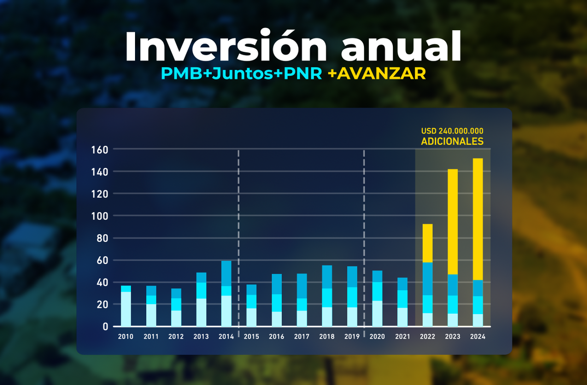 El gobierno destaca la inversión proyectada y vemos en la gráfica la evolución de recursos. El Plan Avanzar destinará en este período unos 480 millones de dólares.