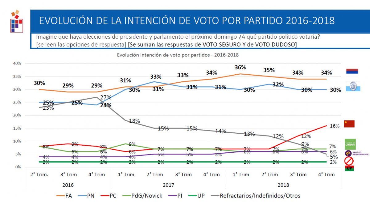 El Frente Amplio recogería el 34% de la intención de voto, el Partido Nacional 30%, Partido Colorado 16%, Partido de la Gente 7%, Partido Independiente 6%, Unidad Popular 2%, y “otros, en blanco y anulado” 5%.