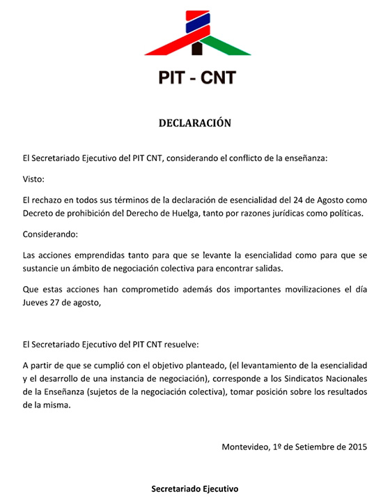 En un comunicado emitido este martes, el Secretariado Ejecutivo del PIT-CNT informa que dado que se cumplió el objetivo del levantamiento de la esencialidad y el desarrollo de una instancia de negociación “corresponde a los sindicatos nacionales de la enseñanza (…) tomar posición sobre los resultados de la misma”.