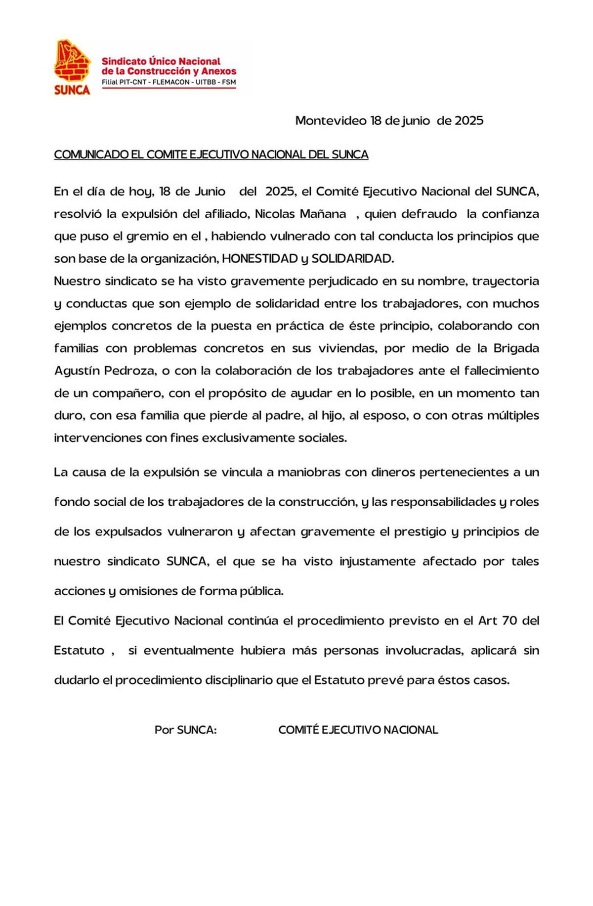 La expulsión es por haber “defraudado la confianza que puso el gremio en él”, dice el Sunca, “habiendo vulnerado con tal conducta los principios que son base de la organización, honestidad y solidaridad”.