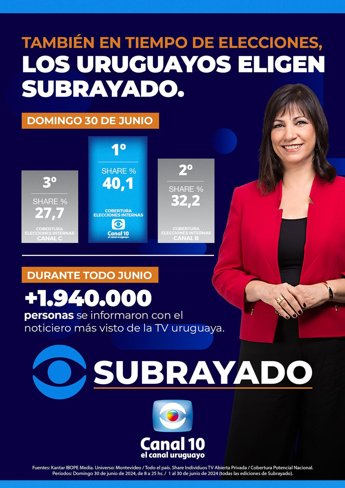 La cobertura de las Elecciones Internas de Subrayado fue la más elegida por los televidentes este domingo 30 de junio. La transmisión general de Canal 10 durante la jornada electoral alcanzó el primer lugar con el 40,1% de la audiencia.