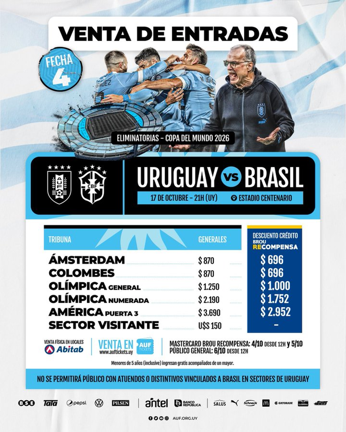 La Asociación Uruguaya de Fútbol(AUF) difundió los precios para ver el partido de Uruguay ante Brasil, en el Estadio Centenario.