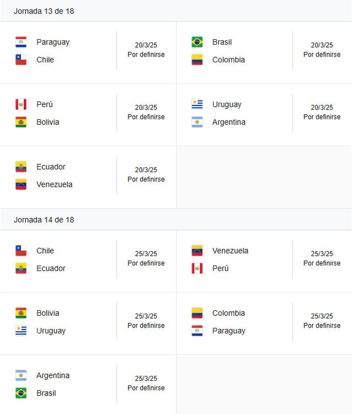 Las Eliminatorias vuelven recién en marzo, con dos partidos: el 20 y el 25 de ese mes. Uruguay recibirá en el Centenario a Argentina y luego viajará a la altura para enfrentar a Bolivia.