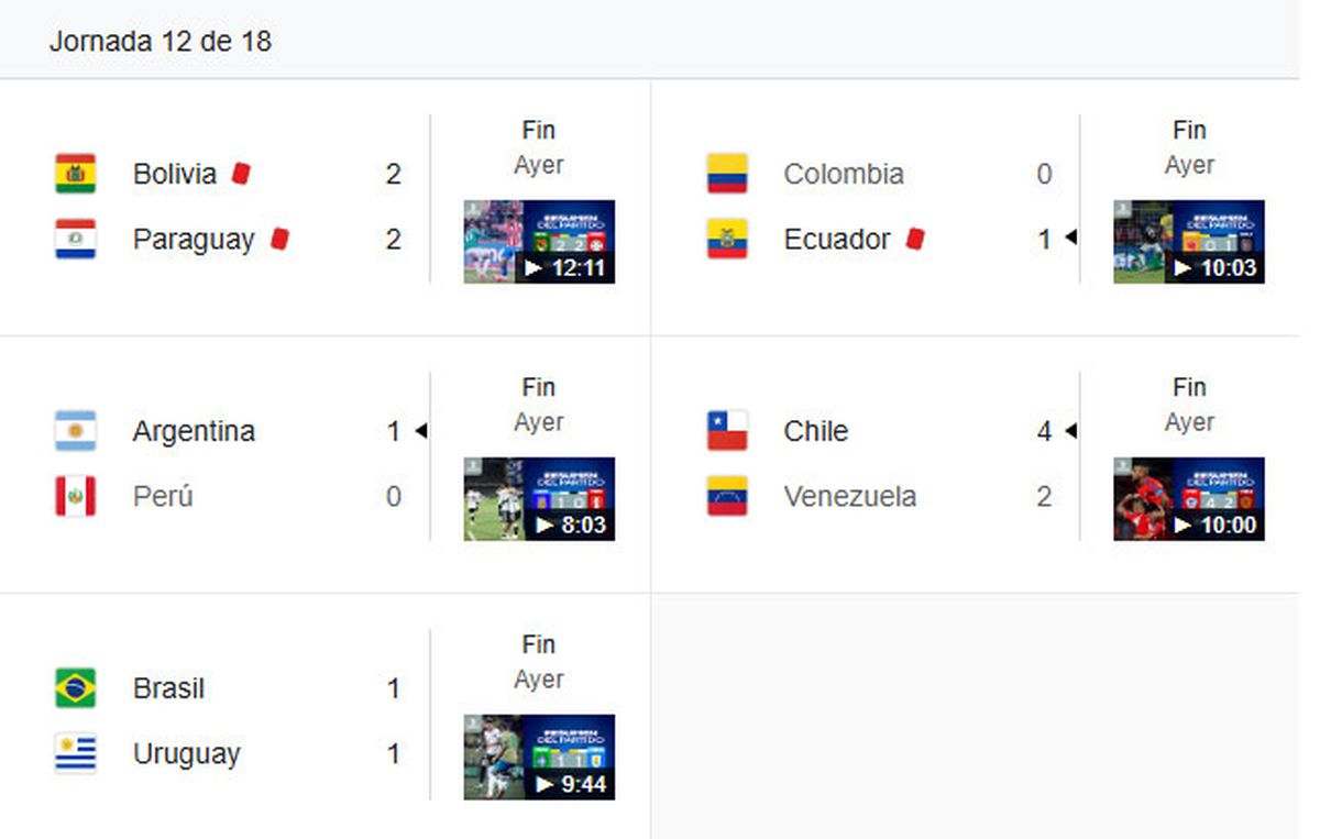 Con Colombia en cuarto lugar, le sigue Brasil con 18, que en esta doble fecha acumuló dos empates, con Venezuela primero y el martes con Uruguay.