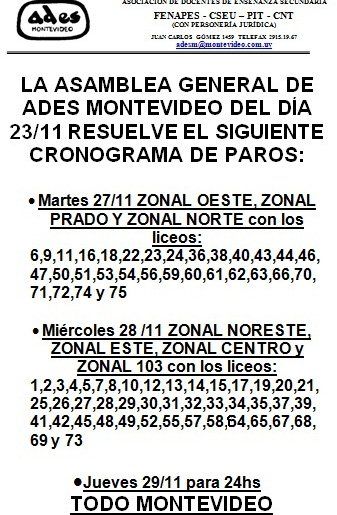 El sindicato de profesores de Secundaria de Montevideo (ADES) inicia este martes 27 dos días de paros zonales en los liceos de la capital que terminarán el jueves 29 con un paro total, en todos los liceos de la ciudad.
