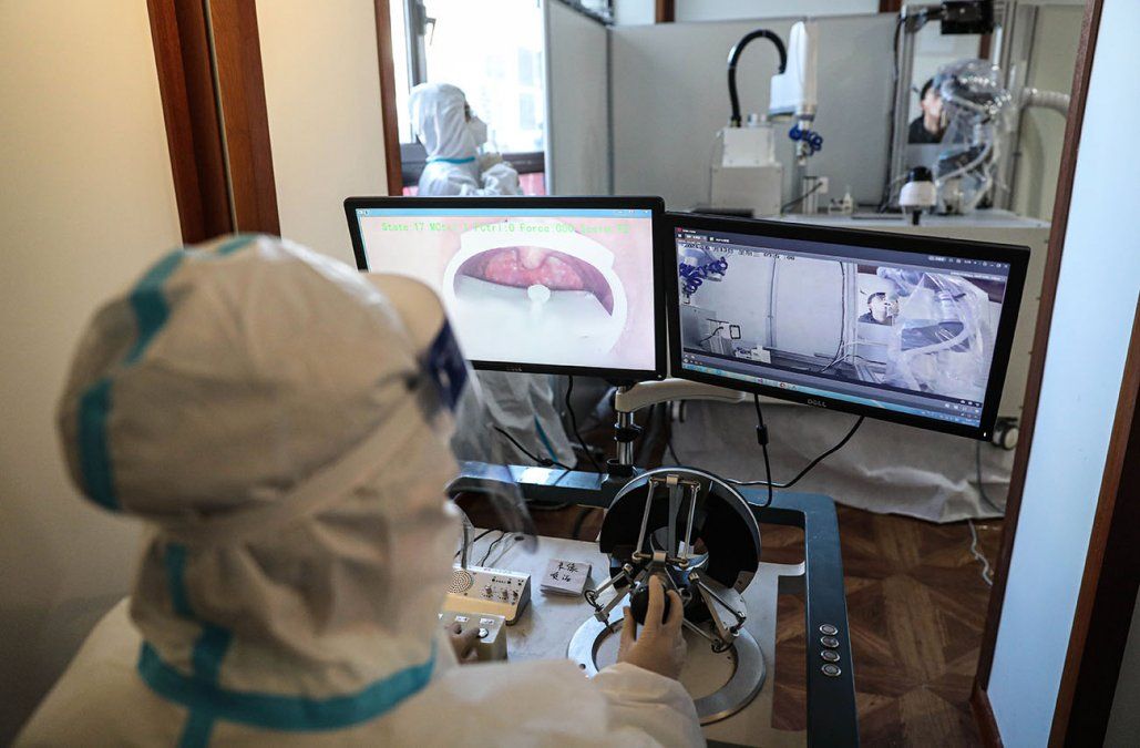 El robot entonces dirige el hisopo hacia la garganta del paciente. Un operador cubierto por un traje de protección completo controla toda la operación de manera remota a través de una cámara instalada en el brazo robótico articulado y una pantalla de control.