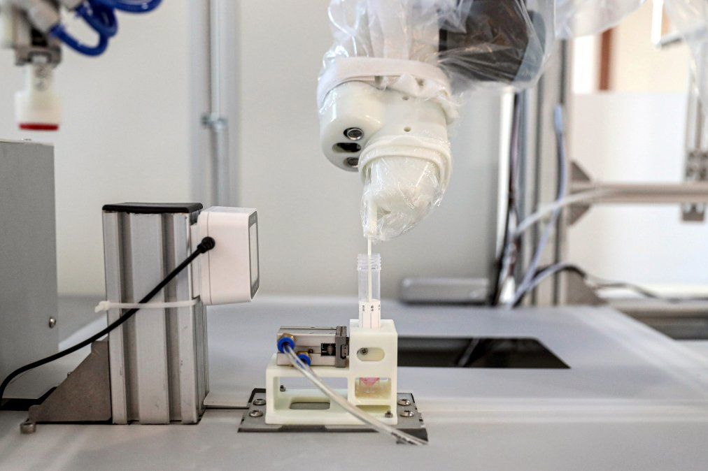 Este brazo articulado, controlado en forma remota por un operador, raspa delicadamente la garganta de los pacientes con un hisopo.