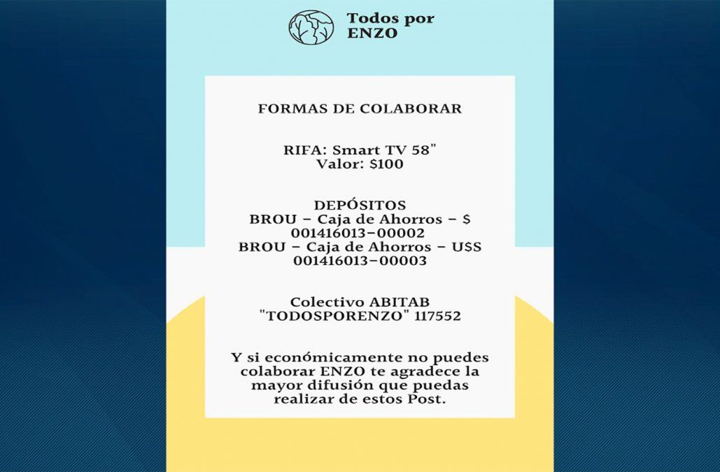 En Abitab se puede colaborar en el colectivo “Todos por Enzo” 117 552, o en las cuentas BROU Caja de Ahorro en pesos 001416013-00002 y en dólares 001416013-00003.