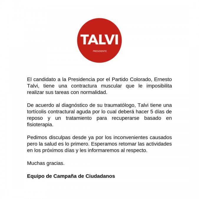 El candidato del Partido Colorado, Ernesto Talvi, suspendió sus compromisos políticos por el resto de la semana, a raíz de una contractura muscular que lo obliga a guardar reposo.