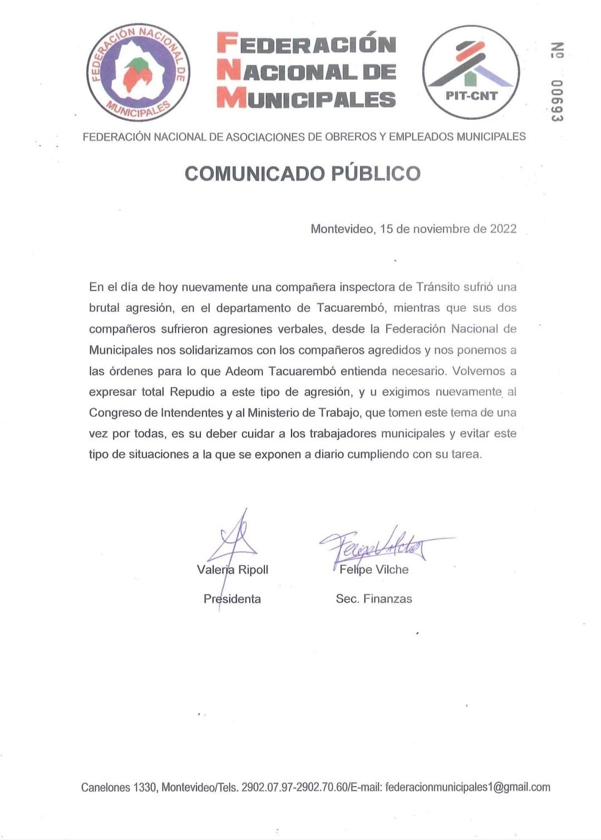 En Tacuarembó, una inspectora de tránsito también fue agredida este martes. Además, los compañeros de trabajo de la mujer fueron insultados. Así lo denunció la Federación Nacional de Municipales en un comunicado, donde califica el hecho de "brutal agresión" y expresó su repudio al hecho y pidió que el Congreso de Intendentes y el Ministerio de Trabajo analicen este tema.