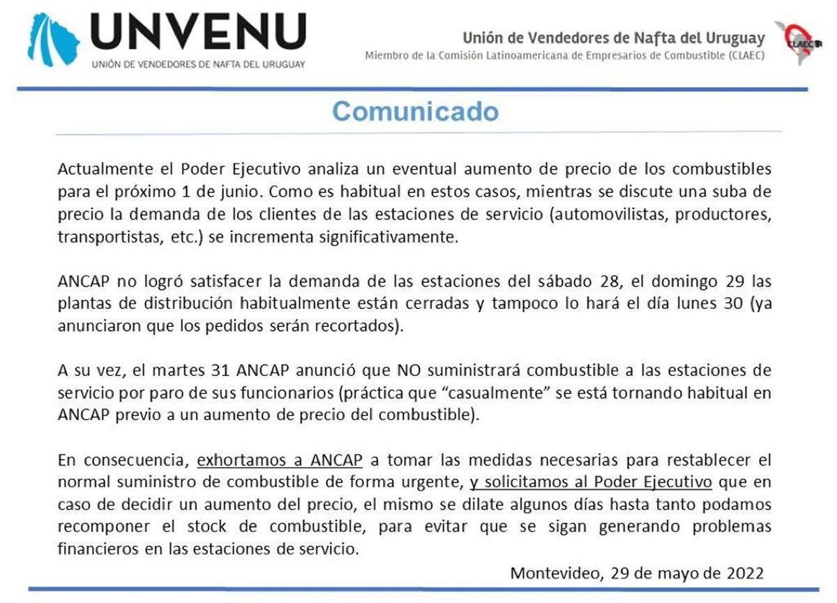 Por todo esto, los vendedores de nafta le exigen a ANCAP que tome las medidas necesarias para restablecer el suministro normal de combustible, y solicita al gobierno que de resolver un nuevo aumento de precios, “el mismo se dilate algunos días” para darles tiempo de recomponer el stock.