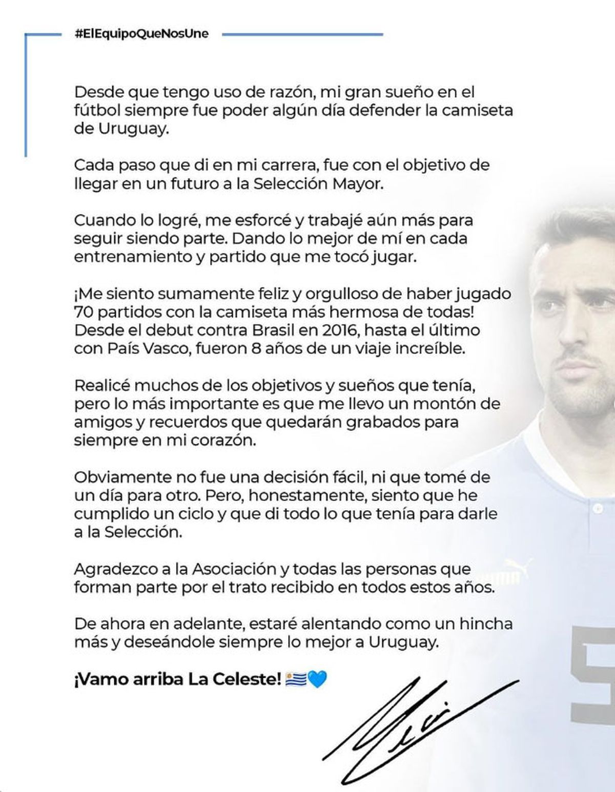 “De ahora en adelante estaré alentando como un hinchas más y deseándole siempre lo mejor a Uruguay”, finaliza Vecino.